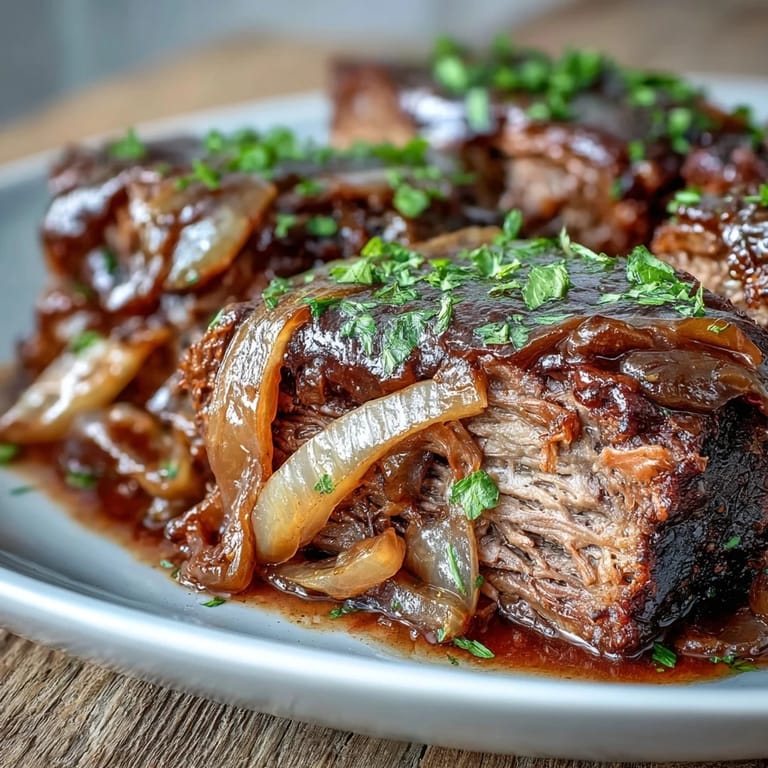 I made this for a Sunday dinner with friends who showed up hungry and cold from a long hike. Watching them tear into slices of beef smothered in glossy onions and cheese, mopping up every drop of sauce with bread, I realized this was the kind of dish that makes people linger at the table. Someone asked for the recipe before dessert even came out. It became my go-to whenever I wanted to feed a crowd without being stuck in the kitchen all day.