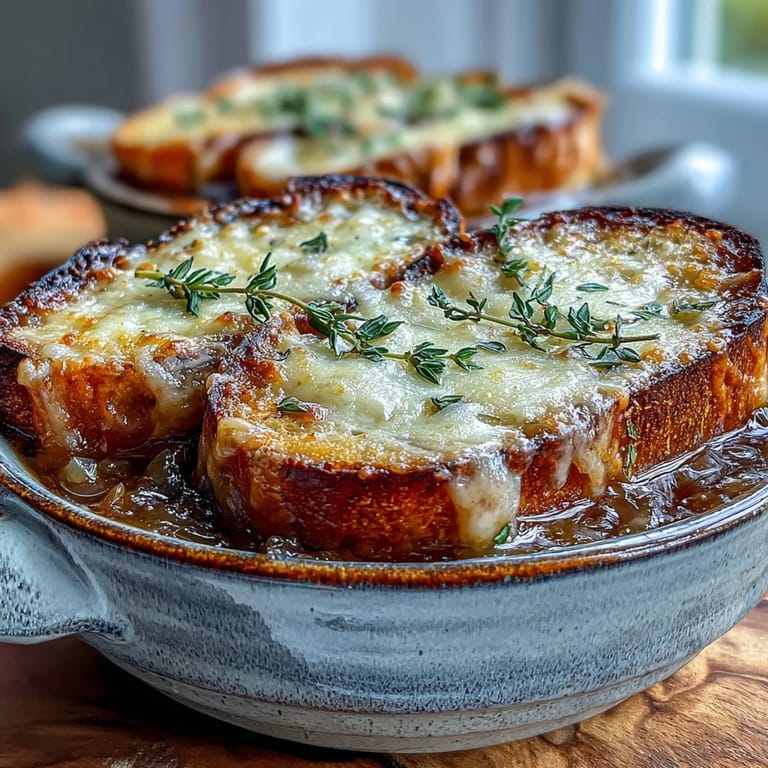 French onion soup is meant to be a moment, not just a meal—serve it in beautiful bowls if you have them, and give yourself time to enjoy it properly. A crisp green salad on the side cuts through the richness, and if you want to get fancy, a glass of white Burgundy or even a simple Sauvignon Blanc plays beautifully with the sweetness of the onions. This isn't fast food; it's the kind of thing you eat slowly, letting the flavors change as it cools slightly and the bread softens into the broth.